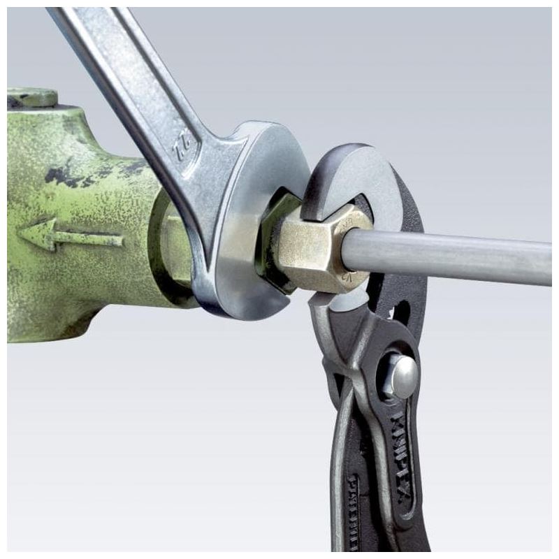 The benefits of the multiple slip joint spanner are plain to see. It is light and stable, can be adjusted to screws and nuts quickly at the touch of a button and is self-locking as from a wrench opening of 17 mm. This multiple slip joint spanner has been developed specifically for hex nuts and bolts. Position the Knipex multiple slip joint spanner quickly and accurately with just one hand movement.The spring-loaded hinge bolt locks securely into place without adjusting inadvertently. Thanks to the 15-fold fine adjustment, the Knipex multiple slip joint spanner can be perfectly adjusted to different sizes of the component. This fine adjustment also makes sure that the distance to the handles remains hand-friendly for every grip width. Screws are tightened and released according to the ratchet principle. The Knipex multiple slip joint spanner clamps onto the component securely by itself as from a wrench opening of 17 mm thanks to the jaw geometry developed by Knipex. This means the user can put all energy into the desired movement without pressing the pliers handle together and thus without energy loss: in the case of the multiple slip joint spanner , especially into the releasing and tightening of bolted connections.