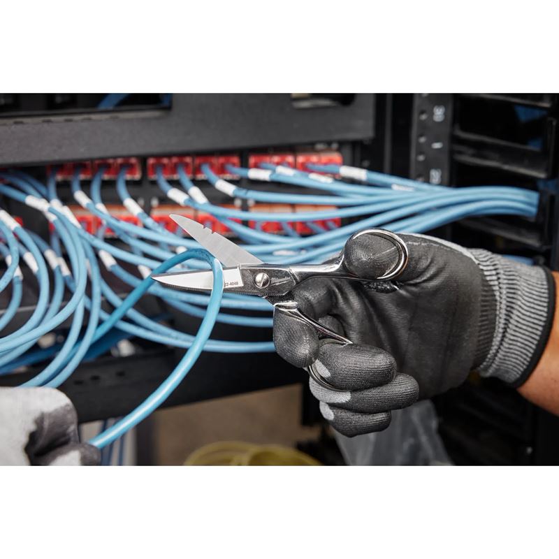 Our Electrician Scissors make easy cuts through cable and wire with the sharp blades. Nickel-coated steel blades stay sharp and maintain blade durability. Designed specifically for electrical and telecommunication applications, these scissors feature two stripping notches on the upper blade to easily strip 19 AWG and 23 AWG wires. The full blade serrated edge provides precise, non-slip cutting action.